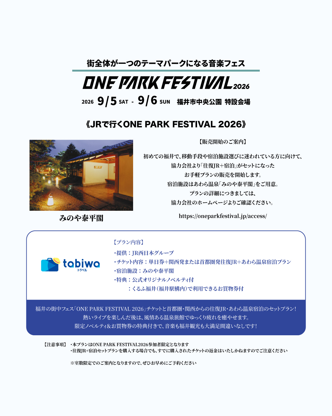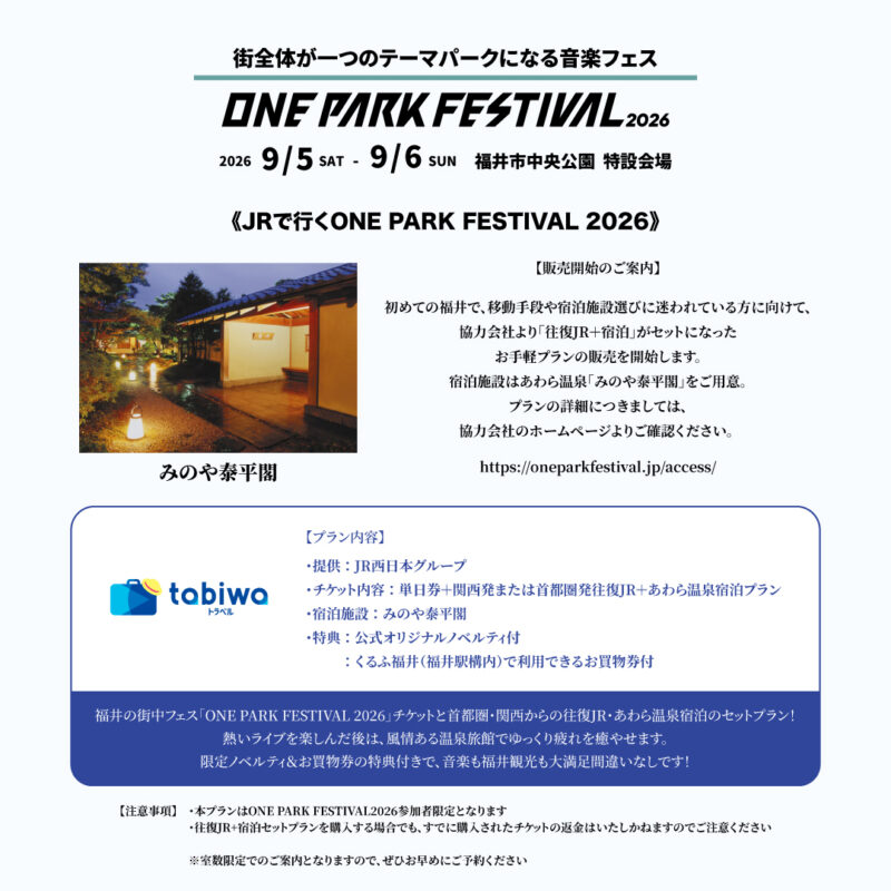 福井の街中フェス「ONE PARK FESTIVAL 2026」チケットと首都圏・関西からの往復JR・あわら温泉宿泊のセットプラン!