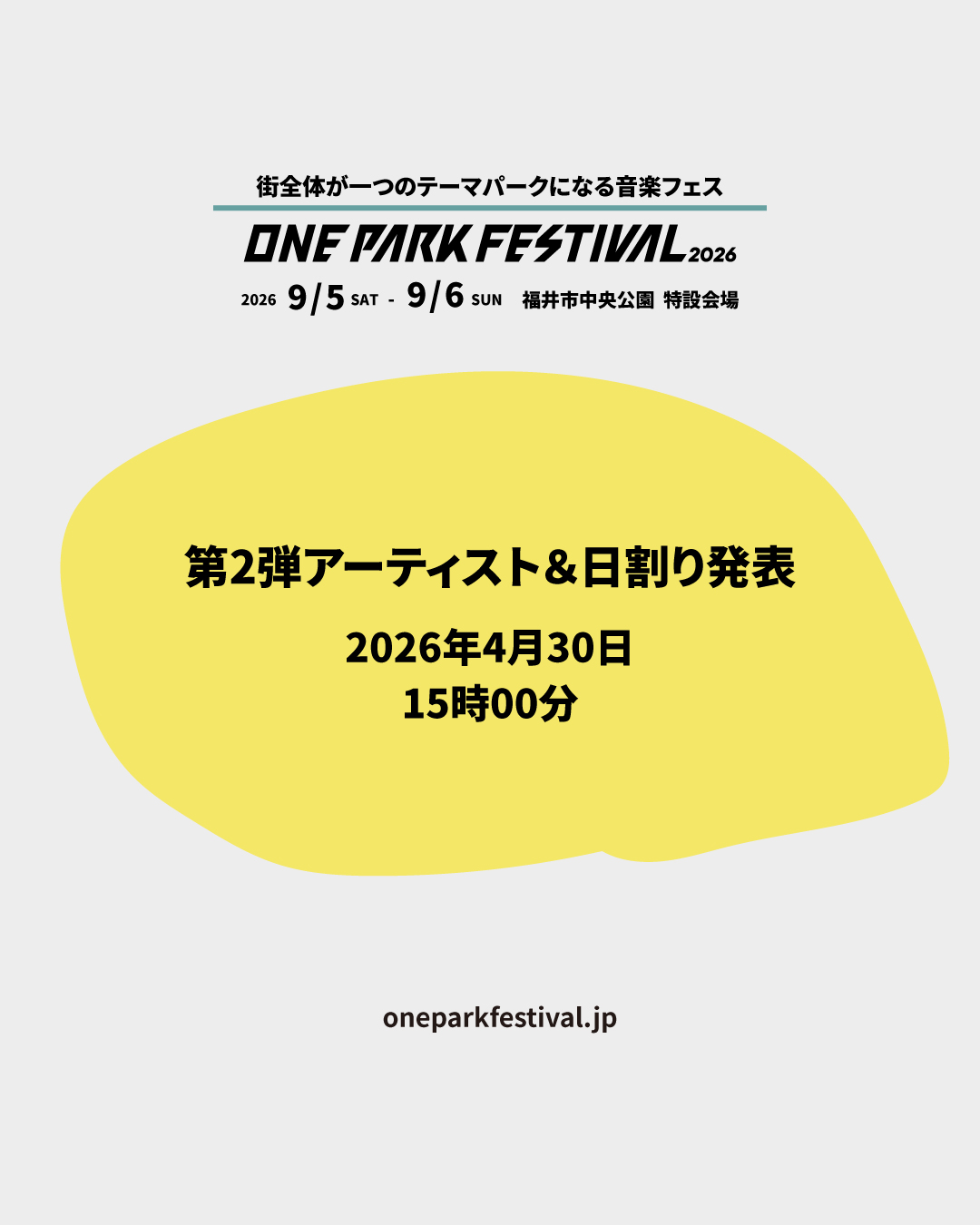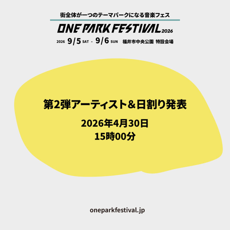 2026.04.29 (予告)2026年4月30日 15時00分 第2弾アーティスト&日割り発表 2026年4月30日 15時00分 出演アーティスト第2弾、及び出演日割りの発表します! ご期待ください!